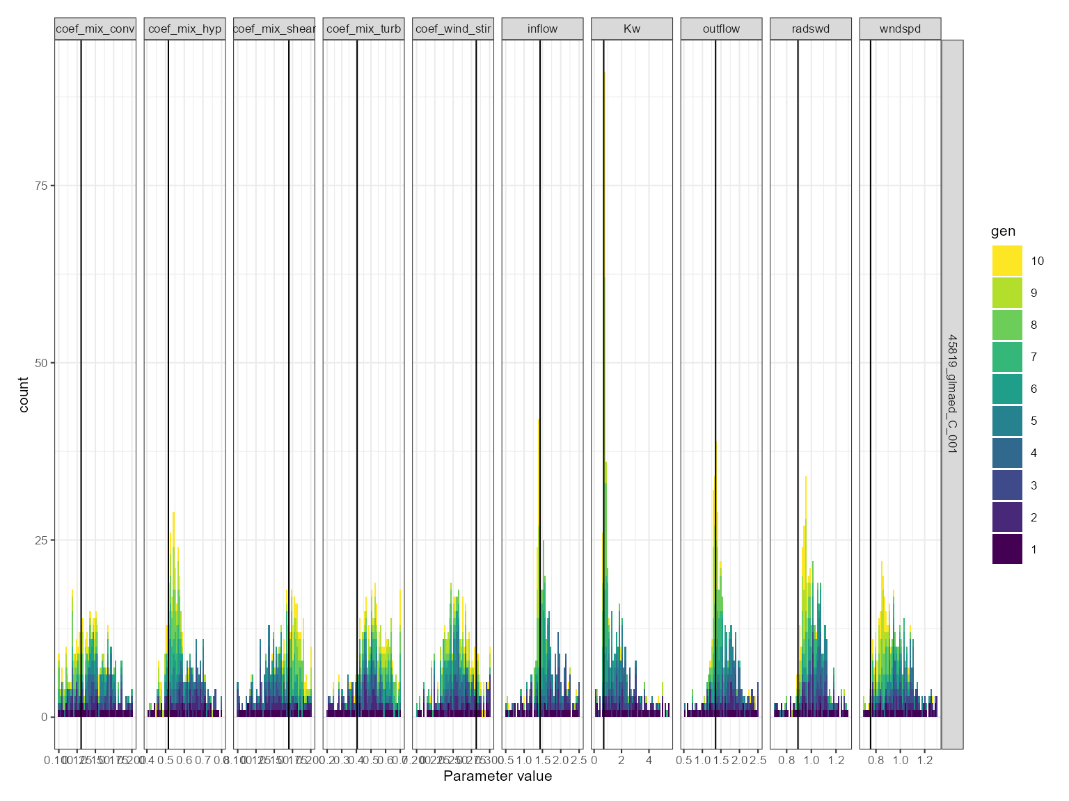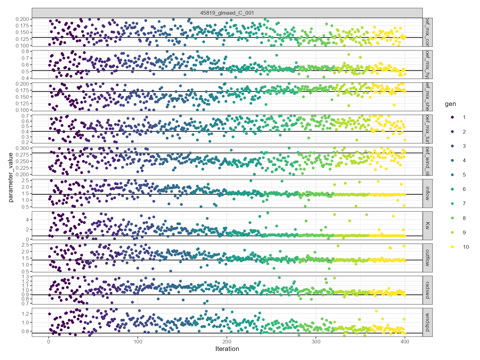 This is more generally used for assessing model convergence. The convergence plot shows the values use over the iterations. The parameter value is on the y-axis and the iteration is on the x-axis. It is faceted by the parameter name. The parameter values are coloured by the generation. The best fitness value for each generation is shown as a solid horizontal black line.