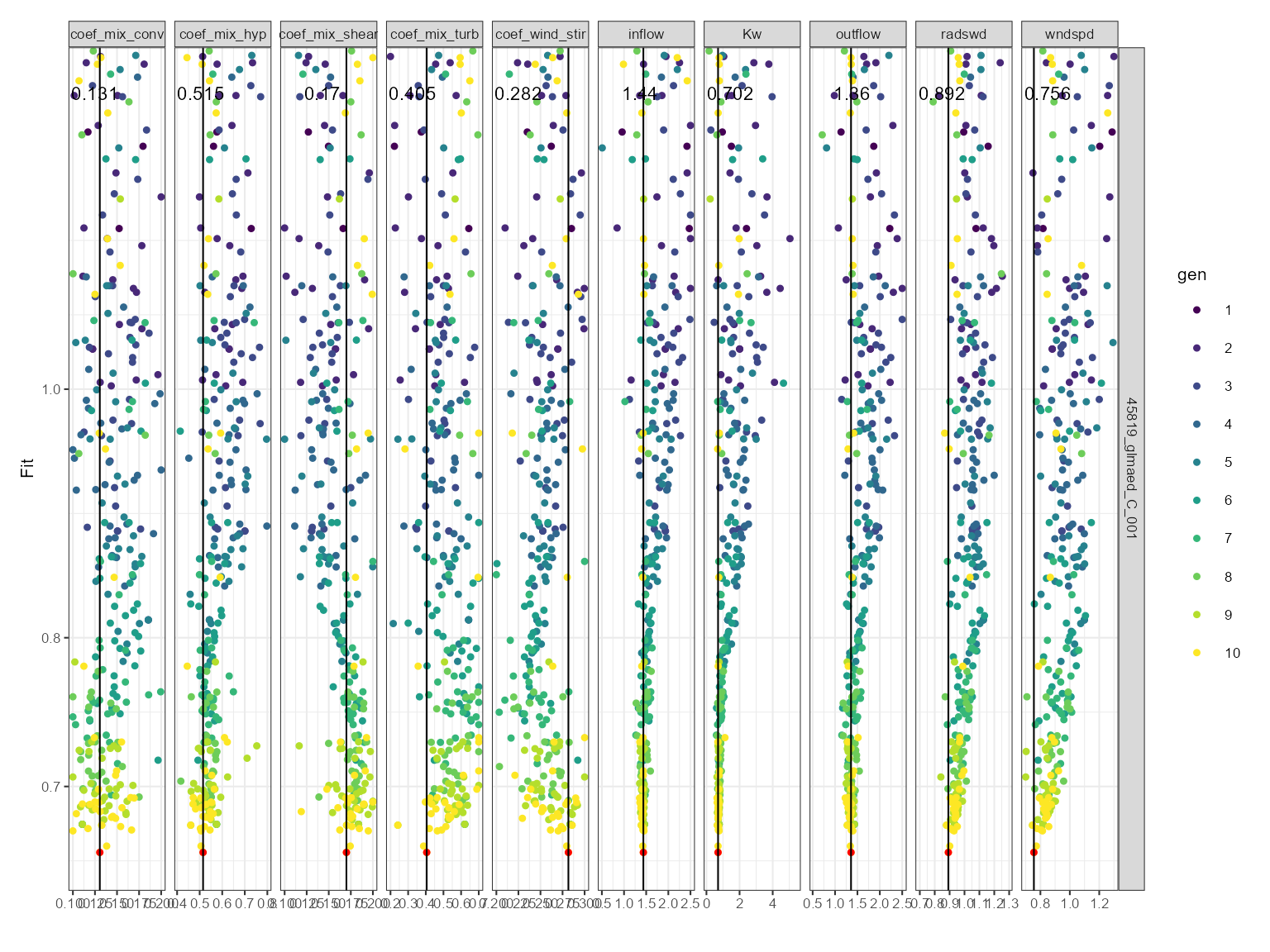 This can be used for comparing sensitivity across parameters. The dotty plot shows the fitness value for each parameter value for each generation. The fitness value is on the y-axis and the parameter value is on the x-axis. It is faceted by the parameter name. The parameter values are coloured by the generation. The best fitness value for each generation is shown as a black line with a red dot.