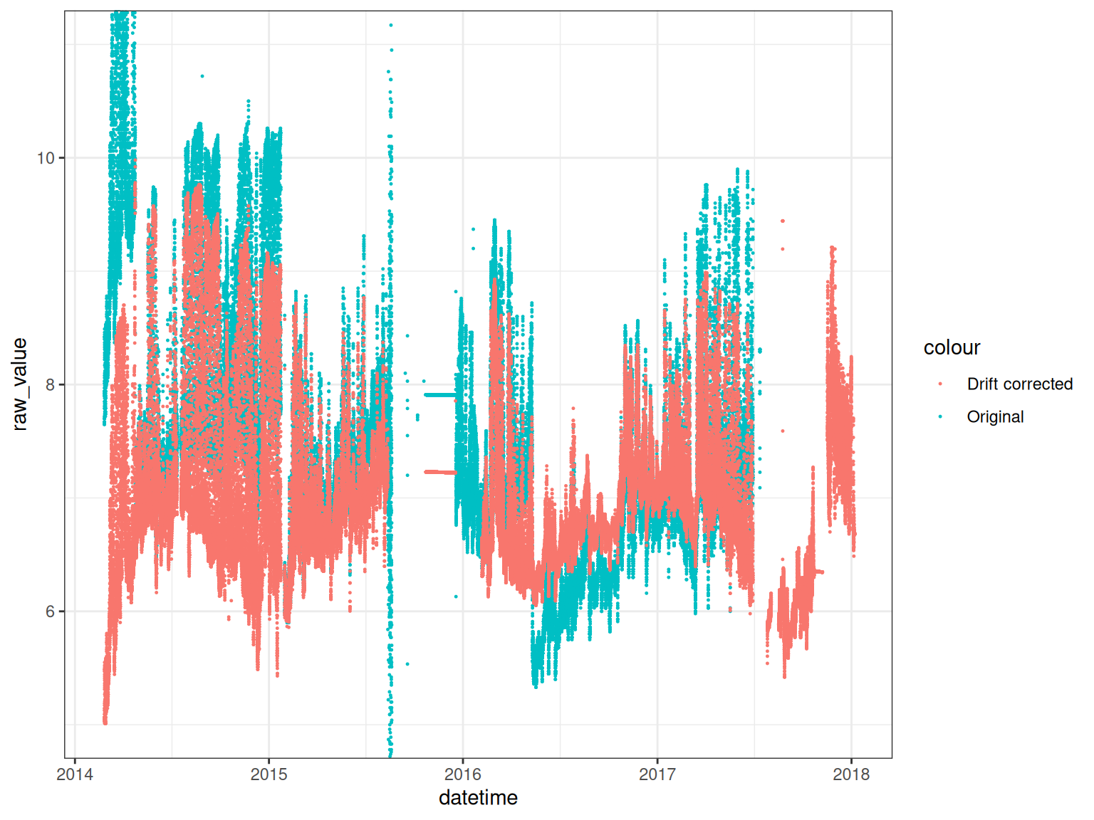 geom_point(data = high_temp, aes(datetime, raw_value, colour = var_ref_id), size = 0.2) +